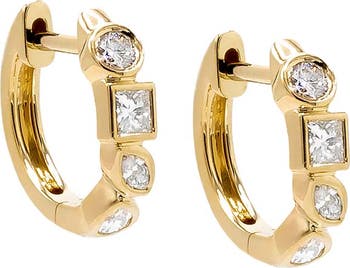 Experience a sophisticated twist on classic huggies with our Diamond Multi Shape Bezel Earrings. Crafted from 14K gold, these earrings feature an exquisite mix of diamonds: 2 round brilliant cut diamonds (0.09 carats), 2 marquise cut diamonds (0.06 carats), 2 pear cut diamonds (0.10 carats), and 2 solitaire cut diamonds (0.09 carats), all set in bezel settings. The total diamond weight is 0.34 carats, delivering a radiant and varied sparkle. With a hoop size of 11.5 mm and a total weight of 1.79 grams, these earrings are sold as a pair, promising to add a touch of elegance and versatility to your jewelry collection.