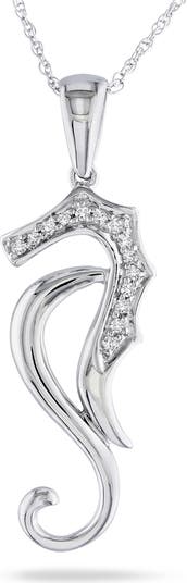 A unique everyday choice, this Diamond-accent Sea Horse Pendant Necklace is crafted in lustrous white gold. Sculpted with gentle swirls into a graceful openwork design, this pendant is pave set with 14 icy round diamonds and is linked to a 17-inch-long rope chain secured with a spring ring clasp.