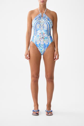 Inspired by Dolmabahçe and Çırağan Palaces, the Ottoman Opulence Diamond Neck Halter One Piece With U Ring Front is a handcrafted silhouette designed by our in house artisans. Reimagined in an exclusive limited edition print, this halter neck one piece is made with A to C cups in mind with soft, removable cups. Its high neck is secured by halter neck ties with charm details at the ends and is cut with a regular leg line. It features a U ring hardware detail at the front and is finished with intricately placed crystal embellishment for luminous detail.