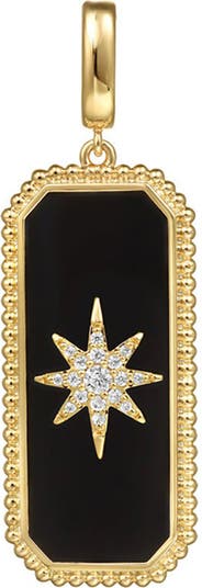 A slender pendant in high-shine 14-karat gold is beautifully designed with a glittering diamond starburst inside an inky onyx center.