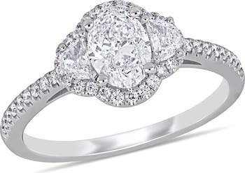 This unique quatrefoil diamond halo engagement ring is crafted in 14-karat white gold and features an oval-cut, prong-set shimmering diamond flanked by two half moon-cut, prong-set diamonds and 79 round-cut, buttercup-set diamonds in a trendsetting quatrefoil halo bridal design. With a sophisticated look and a modern flair, this engagement ring is a perfect choice for a woman with a bold and distinctive sense of style. Choose this piece for the woman you love and you celebrate this milestone and begin the next chapter of your lives together.