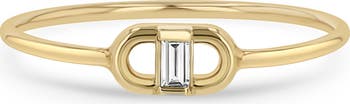 A baguette-cut diamond intersects an oval link at the center of this modern ring crafted from 14-karat gold.