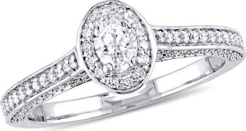 This gorgeous engagement ring is crafted in 14-karat white gold and features an oval-shape halo design with added shimmer along the band. This ring is the perfect choice for your loved one as you celebrate this special time.