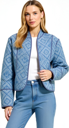 Add a modern twist to your layering game with this quilted jacket featuring an allover diamond pattern and sleek piped trim. The open front and relaxed silhouette create a chic, casual vibe, perfect for pairing with denim or tailored separates. Light padding offers comfort without bulk, while the distinctive pattern gives this jacket standout appeal. Finished with subtle structure at the collar and hem for a polished look.