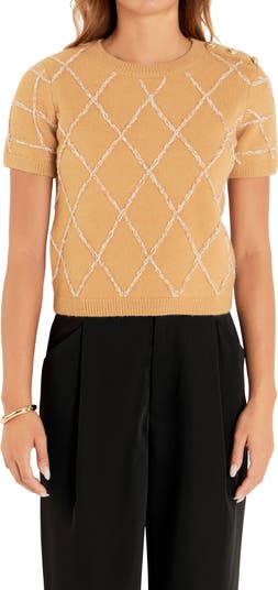 A braided diamond pattern adds polished texture to this cozy wool-kissed sweater trimmed by cozy ribbing and knit with short sleeves for season-spanning charm.