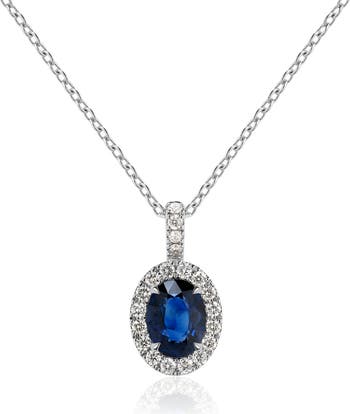 Dazzling round-cut pavé diamonds halo a stunning oval-cut sapphire on this captivating pendant necklace made from 14-karat white gold.