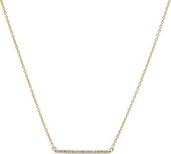Introducing the Adina Eden Diamond Pave Bar Necklace in 14K Gold, a refined and elegant piece designed to add a touch of sparkle to any outfit. This exquisite necklace features a slender bar pendant adorned with 15 round brilliant-cut natural diamonds, totaling 0.09 carats. The bar, measuring 2MM x 20MM, is crafted from luxurious 14K gold, offering a delicate yet striking design. With a total weight of 0.36 grams, this necklace sits comfortably on the neckline. The 15-inch chain, plus a 2-inch extender, allows for versatile styling and a perfect fit. Ideal for everyday wear or special occasions, this diamond pave bar necklace is a timeless addition to any jewelry collection.
