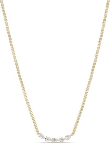 A line of five pear-shaped diamonds shines at the center of a pillowy box-chain necklace gleaming in 14-karat gold.