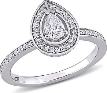 This engagement ring is crafted in 14-karat white gold and features a stunning teardrop halo diamond studded design with added shimmer along the shank. This ring is a perfect choice for a modern and sophisticated bride-to-be.