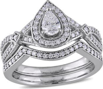 Diamond Pear Halo Vintage Bridal Ring Set 14k