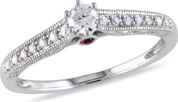 This brilliant ring features a round-cut diamond center stone with accenting pink sapphire and diamonds set in 14k white gold. Ring glimmers with milgrain polished finishing.