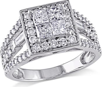 Princess-cut diamonds are a popular choice for engagement rings. This ring features a center square of four princess-cut diamonds. White gold jewelry features rhodium-plating to enhance its white appearance.