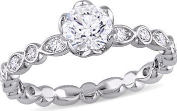 This trendsetting floral infinity diamond engagement ring is crafted in 14-karat white gold and features a round-cut, bezel-set diamond at the center with six round-cut, bezel-set diamonds studded in a floral motif with an additional eight round-cut, pave-set diamonds rested along its infinity shaped band. This exquisite piece is the perfect symbol of true love and commitment. Polished to a brilliant shine, this gorgeous engagement ring a perfect choice for the woman you love as you celebrate this special milestone and begin the next chapter of your lives together.