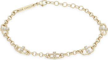 A slim chain bracelet crafted from 14-karat gold showcases diamond-adorned stations for elegant shine.