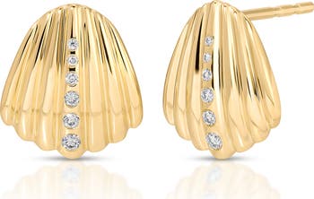 A graduated stream of diamonds highlights the organic beauty of these shell stud earrings crafted from 14-karat gold.