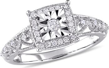 Celebrate a commitment with the exquisite sparkle and antique-inspired beauty of this ring. Fashioned in bright sterling silver, the dramatic square halo design enhances the center's brilliance, creating a magnificent display of light. This piece features intricate detailing that whispers of timeless romance and enduring promise. It is a perfect symbol to mark the beginning of your journey, delivering sophisticated elegance meant to be cherished forever.