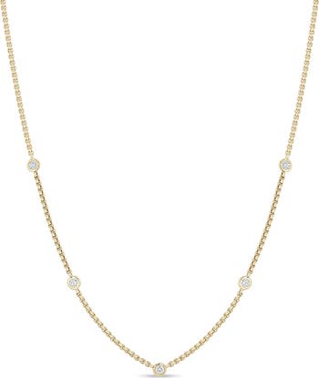 Five bezel-set diamonds add stations of sparkle to a box-link necklace crafted from 14-karat gold.