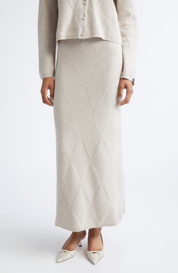 This ankle-grazing sweater-skirt translates artisanal stitchwork into pattern play, using a repeating diamond grid to build texture across exceptionally soft cashmere. The fine gauge reads polished while lean rib finishes give a concise frame.