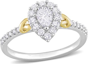 This exquisite halo diamond ring is crafted in lustrous 14k white gold with yellow gold. This stunning ring features a pear-cut, prong-set diamond encased in a halo design created by 24 round-cut, buttercup-set diamonds and extending halfway into the band. Polished to a brilliant shine, this sparkling ring is the perfect choice.