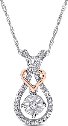 Fall in love with the perfect blend of elegance and romance! This Diamond Teardrop and Heart Motif Pendant in Two-Tone 10k White and Rose Gold is a stunning symbol of beauty and grace. The delicate heart and teardrop design, adorned with shimmering diamonds, creates a timeless piece that will add a touch of sparkle to any outfit. A gorgeous choice for any occasion, this pendant is sure to make a lasting impression.