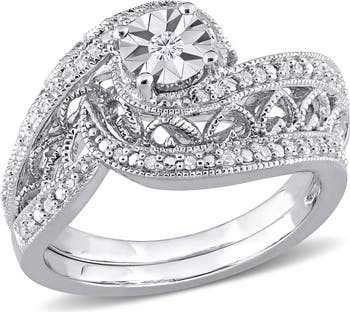 Embrace the timeless beauty and delicate artistry of this vintage bridal set. Crafted in luminous sterling silver, the set includes an engagement ring and a perfectly contouring wedding band. Both rings feature subtle detailing that evokes the sophisticated romance of a bygone era. The diamonds provide a graceful, charming sparkle, making this set a beautiful and cherished symbol of your enduring love.