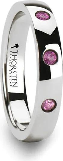 Diana Domed White Tungsten Wedding Band with 3 Pink Sapphires - 4 mm is a domed white tungsten ring designed to balance durability with a feminine look. It features three round-cut pink sapphires totaling 0.1 carat and a polished, mirror-like shine. The three stones symbolize the past, present and future of a couple's love.