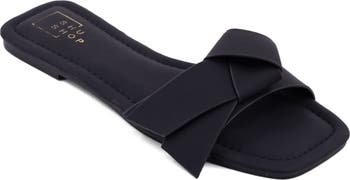 A modern bow embellishment heightens the everyday allure of a minimalist slide sandal grounded by lightweight comfort cushioning.
