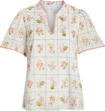 Crochet-inspired picot trim and a sweet floral pattern bring a down-home look to this breathable cotton top.