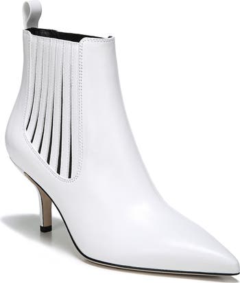 Slightly splayed straps bring vertical geometry to the goring panels of a pointy-toe Chelsea bootie, cantilevered dramatically over a tapered stiletto.