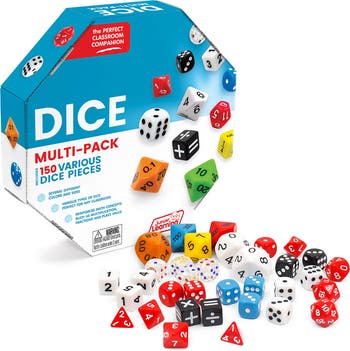 - 150 VARIOUS DICE PIECES: Includes game dice (up to 20 sides), place value dice (units to thousands), number, colored, and equation dice, offering a wide variety for learning and gameplay.