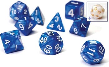 This pearl blue 7-set of Dice comes with the traditional set of 7 dice used for role playing games, including (1) D4, (1) D6, (1) D8, (1) D10, (1) D percentile, (1) D12, and (1) D20. These dice are made of acrylic material that is injection molded. This set also includes an additional, free white pearlescent D20 to facilitate advantage/disadvantage in D&D. The extra white pearlescent is made of high quality Polynesian material.