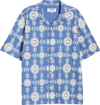 Corded floral lace and openwork details against the cool, breathable cotton make this camp shirt a getaway essential that'll see you stylishly from the pool deck to dinner at the resort.