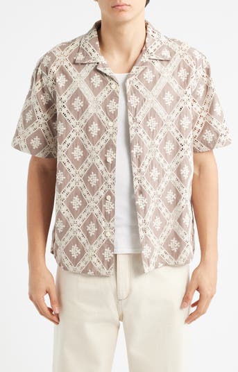 Diamond lace insets bring refined texture to this cotton camp shirt finished with a notched collar and clean button front for elevated weekend polish.