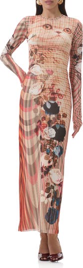 Make a sleek impression in this long-sleeve maxi cut in a smooth, curve-hugging silhouette from gauzy mesh covered in an eye-catching print.