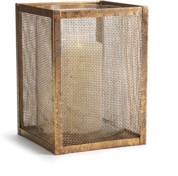 Diego is architectural in design. A light-catching mesh screen in antique gold adds a hint of drama. Complete with glass vases, not hurricanes so as to hold fresh florals as well as candles.