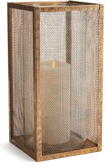 Diego is architectural in design. A light-catching mesh screen in antique gold adds a hint of drama. Complete with glass vases, not hurricanes so as to hold fresh florals as well as candles.