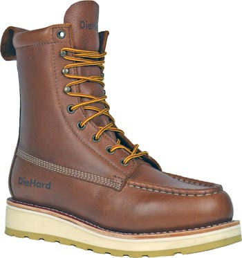 The DieHard Malibu 8 Inch Soft Toe Work Boot delivers premium craftsmanship, long-lasting durability, and all-day comfort for workers who want classic style with modern performance. Expertly crafted from premium tumbled USA leather, this boot features a genuine hand-sewn one-piece moc construction that enhances durability while providing a timeless work-boot look. The leather lining and soft-cushion PU footbed with memory foam deliver supportive comfort to reduce fatigue during long shifts. Goodyear leather welt construction ensures structural integrity and extended wear life, while the composite shank adds underfoot stability. Finished with a slip-resistant outsole, the Malibu 8 Inch Soft Toe provides dependable traction and certified electrical hazard protection, making it a reliable choice for job sites, workshops, and everyday work environments where comfort and durability matter.