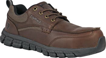 The DieHard Sunbird Composite Toe Work Shoe in Brown delivers durable protection and all-day comfort in a polished, work-ready design. Built with a full-grain tumbled leather upper, it offers long-lasting wear with a professional appearance. An ASTM F2413-18 composite safety toe provides certified impact and compression protection without the weight of steel. Inside, a memory foam insole delivers cushioned comfort, while the Booster Cushion Rebound EVA midsole absorbs shock and supports every step. A moisture-wicking mesh lining helps keep feet cool and dry during long shifts. Finished with cement construction, a composite shank, slip-resistant outsole, and EH rating, the Sunbird is ideal for construction, trades, warehouse, and industrial work environments.