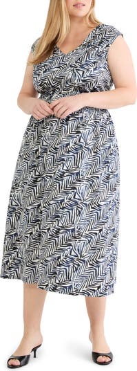 An elastic waist shapes the silhouette of this lightweight cap-sleeve midi cut from stretch cotton and covered in an energizing print.