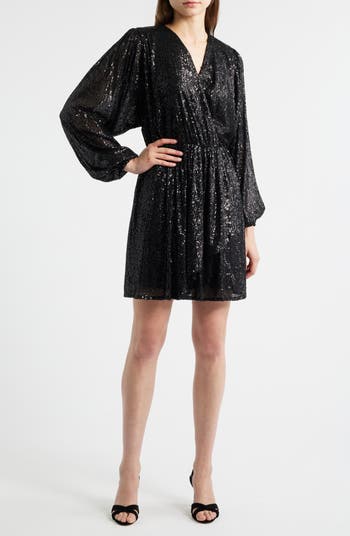 The LBD gets glitzier and easier than ever before in this slip-on dress in a faux-wrap silhouette and dripping in shimmering black sequins.