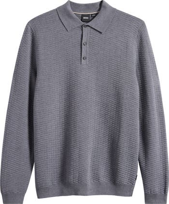 Lightweight and layer-ready, this long-sleeve polo-sweater knit with breathable virgin wool lines up a classic spread collar and tidy rib trim for a look that stays sharp from day to night.