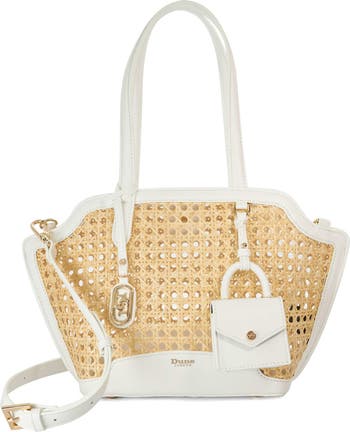 Intricately woven rattan is highlighted by contrasting trims on a spacious shoulder bag designed with a duo of optional pouches for easy organization. An optional crossbody strap offers versatile wear.