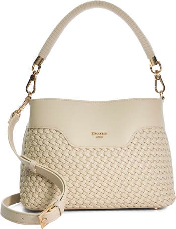 Smooth and woven faux leather create textural interplay on a structured bag designed with multiple interior compartments perfect for organizing the essentials. A removable top handle and crossbody strap offer versatile wear.