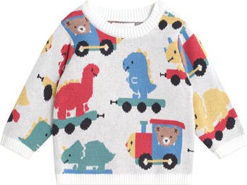 Meet the wear everywhere sweater. This knit jumper is made from premium organic cotton in a deliciously soft jacquard knit. Light enough to layer and cosy enough to wear on its own, itll keep your little one snug as a bug in a dino train.