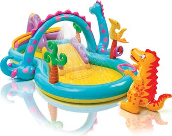 Introduce a prehistoric twist to your backyard with the Intex Dinoland Play Center Kiddie Inflatable Swimming Pool. This 11ft x 7.5ft x 44in pool transforms your outdoor space into a mini waterpark, complete with a soft slide, wading pool, Dino Arch water sprayer, Dino Hoops, and a Volcanic Ball Roller game. The pool, made from durable PVC, holds up to 74 gallons of water, providing hours of refreshing, jurassic fun. The Dinoland Play Center is perfect for children who love dinosaurs and outdoor play. Please note, a filter pump is not included.