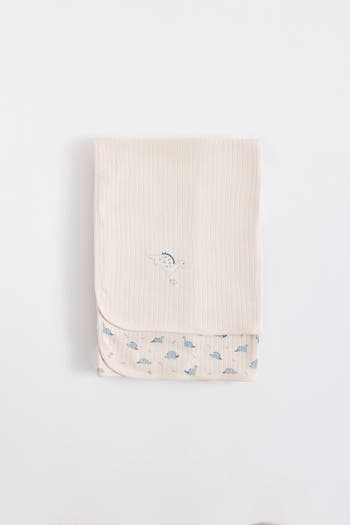 Morley blanket made of soft cotton. It features a print on one side and a plain side with embroidery. It's perfect for covering or swaddling your baby, providing extra comfort and warmth. A practical and cozy option for caring for and protecting your baby at all times.