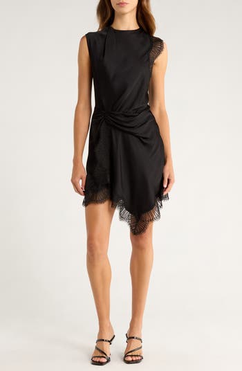 Lacy trim romances this lightweight dress made with a gathered waist for shape and dimension and finished with a drapey asymmetric hem.
