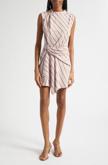 Crisp stripes heighten the contemporary charm of this sleeveless minidress in an asymmetric silhouette.