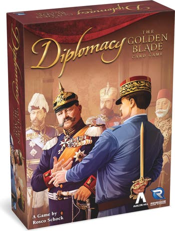 DIPLOMACY: THE GOLDEN BLADE - In the prelude to World War I, the seven Great European Powers contend for supremacy, both with their military might and political maneuvering. In Diplomacy: The Golden Blade Card Game, players must choose and negotiate alliances carefully—knowing when to expand and when to stab. Only the most cunning leader will emerge victorious as The Golden Blade. Diplomacy: The Golden Blade Card Game is a complete stand-alone game for new or experienced Diplomacy players. Provides all the strategy, negotiation, and backstabbing from classic Diplomacy in only 15 minutes per player! Simple turns, deep strategy. Will you strengthen your military prowess, or negotiate an alliance with your neighbor? Will you stay true to your word, or backstab your ally at an opportune moment. No player elimination! All players participate until the end of the game. Plays well at all player counts, from 2 to 7! Great group game for fans of negotiation and social games. Diplomacy: The Golden Blade - 2-7 players ages 15 and up - 15 minutes per player - Diplomacy: The Golden Blade Card Game is a complete stand-alone game for new or experienced Diplomacy players