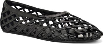 Woven straps add an airy effect to a round-toe ballet flat that exemplifies everyday sophistication.